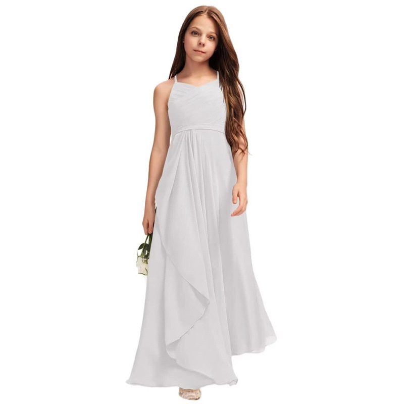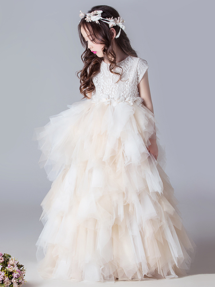 Lange kinderbruidsjurken zijn een echte klassieker. Deze modellen reiken vaak tot de enkels of zelfs tot op de grond en zorgen voor een sprookjesachtige uitstraling. Perfect voor formele bruiloften waar een elegante look gewenst is.