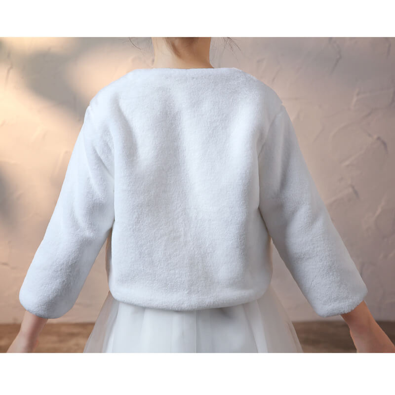 Een chique bolero van imitatiebont met lange mouwen. Perfect om een feestjurkje helemaal af te maken. Mooie kwaliteit. Goede pasvorm.